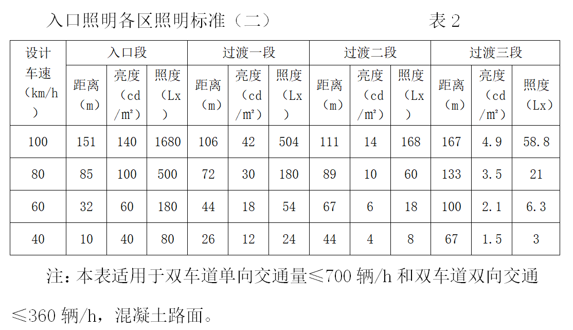 隧道出口由于白天亮度很高,會使司機形成強烈的眩光,因此在隧道出口也同入口部分一樣設有出口段照明,加強垂直照度,出口段長度一般取60m,亮度一般取中間段(基本段)亮度的5倍。隧道出口過渡照明區(qū)照明標準見下表。如果隧道為雙向交通的,那么出口與入口起同樣的作用,此時可不必考慮出口照度。